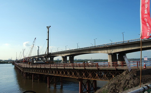 中交第一公路工程局有限公司在激烈的竞争中中标哈尔滨松花江大桥扩建工程,迅速行动,精选强将奔赴冰城。2010年4月28日,中标公示,5月1日,与业主接触;4日,项目人员进场。快进场、快施工,边临建,边施工。18日,钢便桥施工;19日,第一根钻孔桩开钻,哈尔滨王世华副市长到现场剪彩;20日,吹沙筑岛;21日,浇注第一颗钻孔桩;25日,完成项目部驻地建设并入住;6月6日,主桥第一颗桩基开钻;17日,灌注主桥第一颗桩基。6月底,提前计划20天完成便道、便桥施工,迅速展开施工场面。项目部施工速度之快受到了业主好评,哈尔滨市长、松北区区长等政府领导相继到工地视察慰问。