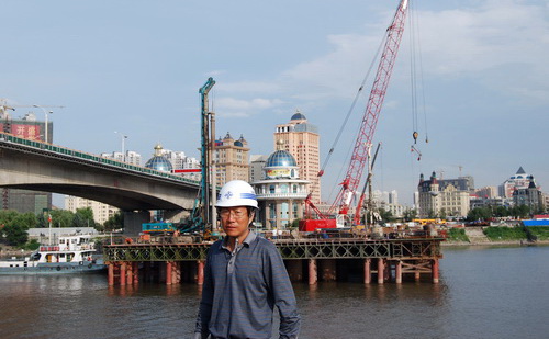 2010年初夏,哈尔滨出现了50年不遇的37度高温,为加快施工进度,项目部职工冒高温、顶烈日,早6:30就到工地劳作,晚7:00才吃晚餐,为尽快建成哈尔滨松花江大桥扩建工程,早日疏通过江交通,忘我工作。因大桥工地紧邻著名风景区太阳岛和水上乐园,施工环境复杂,环保要求高。项目部租用6艘泥浆船、6艘弃渣船、2艘600吨的驳轮、4艘推轮,保证水上施工的钻孔泥浆排放和工程弃渣运输,做到文明施工、环保施工,保证了江水清洁、河道畅通。因为大桥工地地处市区,有很多交通管制,运输砂石料只能晚11:00——早5:00进行,航道也是晚7:00——早7:00通航,项目部遵守交通法规,抓住有限的运输时间,将7万多方沙石、8万多方砖渣运进工地,保证了施工。项目选择有实力的施工队伍,广开工作面,平行作业,加大设备投入,克服进场两个半月无电、无资金的困难,投入2台50吨吊车、4台25吨吊车、5台大型旋挖钻机、18台法循环钻机,1个拌合站,2个商混搅拌站,筑起16个施工岛、5个钢平台,架设便桥450米,便道620米,施工计划咬着节点走,一步一环不松劲。在两个半月的时间里,从进场到施工,速度之快,在公路施工中十分罕见,全桥278根钻孔桩,已完成147根,完成产值4千多万元,大桥下部施工全面展开,业主满意。7月15日,哈尔滨市长张效廉到大桥工地视察,对项目部目前的施工进度和现场的文明施工给予了充分肯定,并鼓励项目部再接再厉,确保公路大桥扩建工程在保证质量的前提下,按时完工。9月11日,黑龙江省代省长王宪魁视察松花江大桥项目时说:“松花江公路大桥不仅对哈尔滨重要,对整个黑龙江都很重要,你们企业在全国是一流的,以后招标还要找你们,相信你们会在保证质量、保证安全的前提下顺利完成冬季施工”。项目经理高俊宏代表项目部全体员工表示绝不辜负省长的期望,确保完成冬季施工任务。