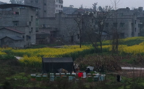 朵朵山花,仿佛是从酣睡中醒来正伸着懒腰,柔弱却又坚强。微风拂来,花枝招展,远远望去有的早已满枝花团锦簇,婀娜多姿地在春光里各领风骚。田间金黄色的油菜花争妍斗丽,蜿蜒曲折的田间道穿梭于茫茫花海,大地一派流金溢彩。五颜六色的小野花竞相开放,给大地披上了彩装,春意更显盎然。春天孕育了万物的生机,百花的乳汁哺育了千万蜜蜂小生灵。在生命轮回中,蜜蜂前赴后继为送给她春天的蜂人报答厚爱,将滴滴甜蜜留在人间。在这样的季节里,总会看见这样的情景:在田间亦或是山坡上,一排排整齐的蜂箱和一个简易的帐篷。没错,那就是养蜂人的临时住所。这个季节是一年中花期最长的时候,是养蜂的希望。养蜂人追花而行,依花而居,金黄色的菜花从南到北盛开半年之久,是养蜂人赖以生存最为理想的蜜源。