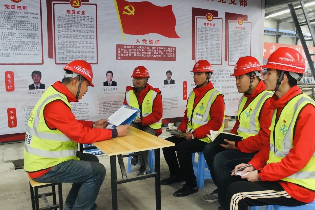 这一幕,发生在钢筋加工场的党员活动站内。这个场地,是专门为岗员们打造的红色活动阵地,也是今后党员学习活动的重要之地。党员文化墙鲜艳夺目,涵盖入党誓词、党员权利、党员义务、党的纪律、党的宗旨等基础内容;同时,还公示了党员“三亮”的具体内容,将党员身份、党员责任、党员承诺上墙,让“隐形党员”变成“显形党员”,自觉接收大家的监督。