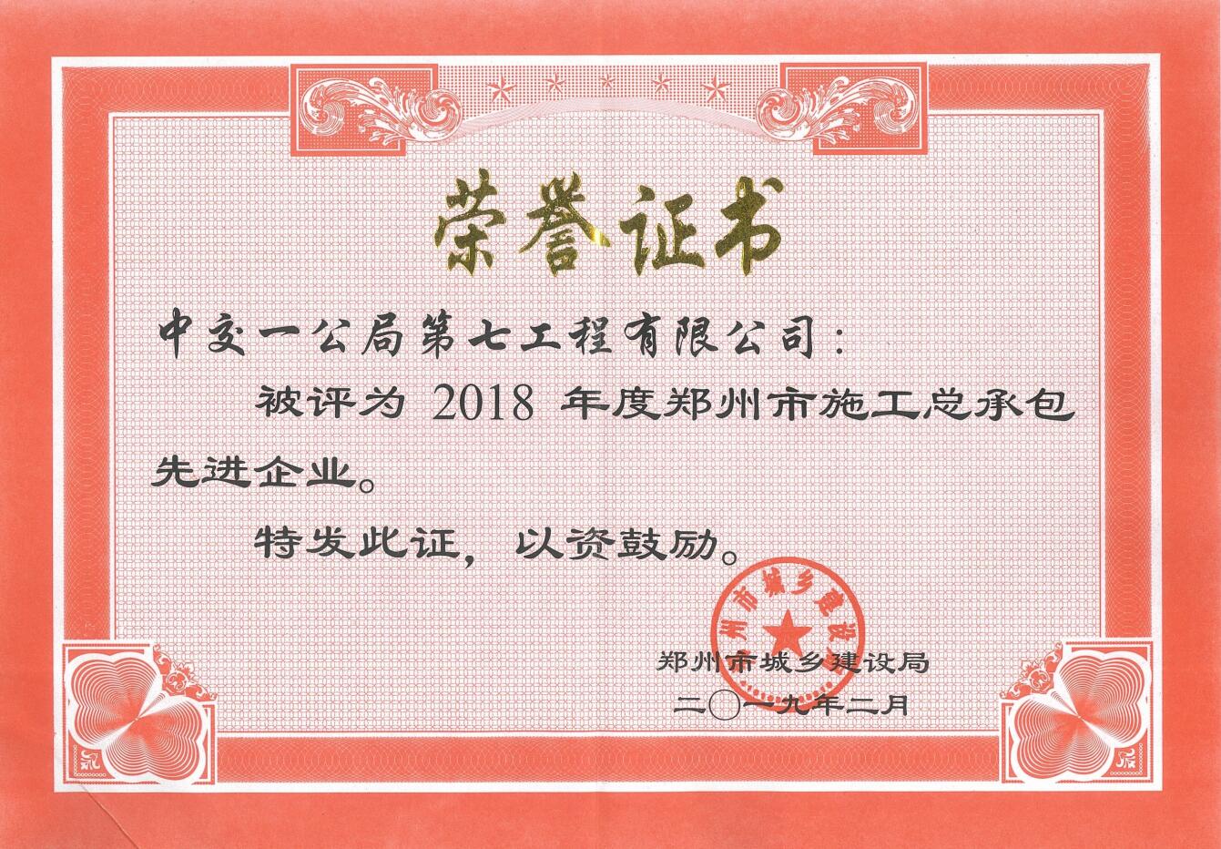 公司被评为2018年度郑州市施工总承包先进企业