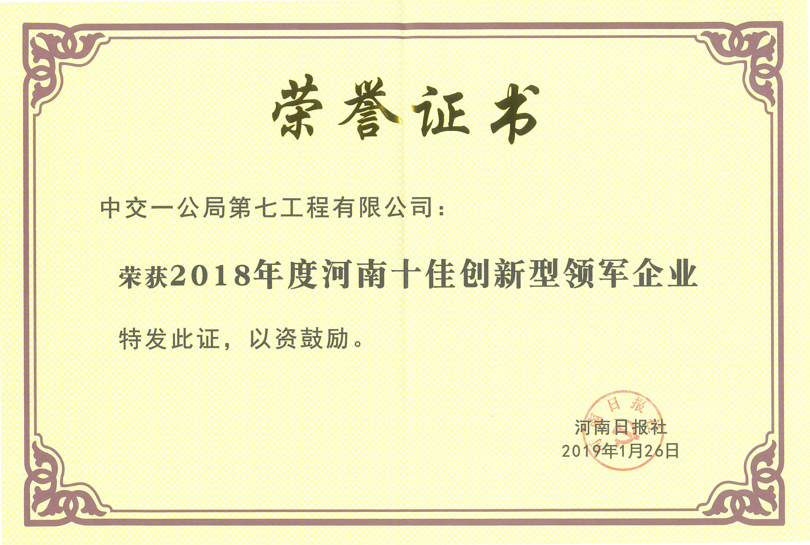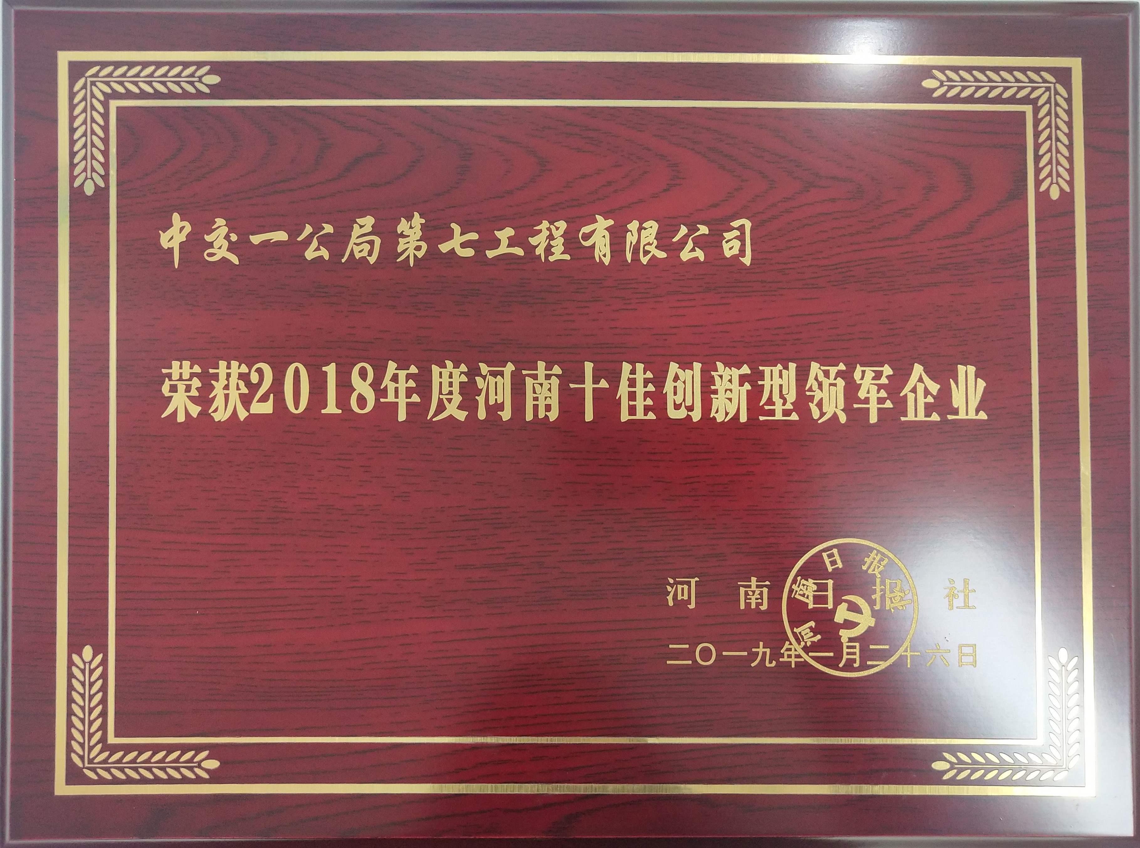 公司荣获2018年度河南十佳创新型领军企业荣誉称号