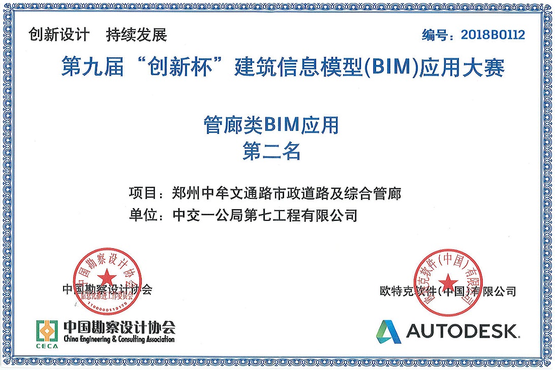 公司荣获国家级第九届创新杯“管廊类BIM应用第二名”