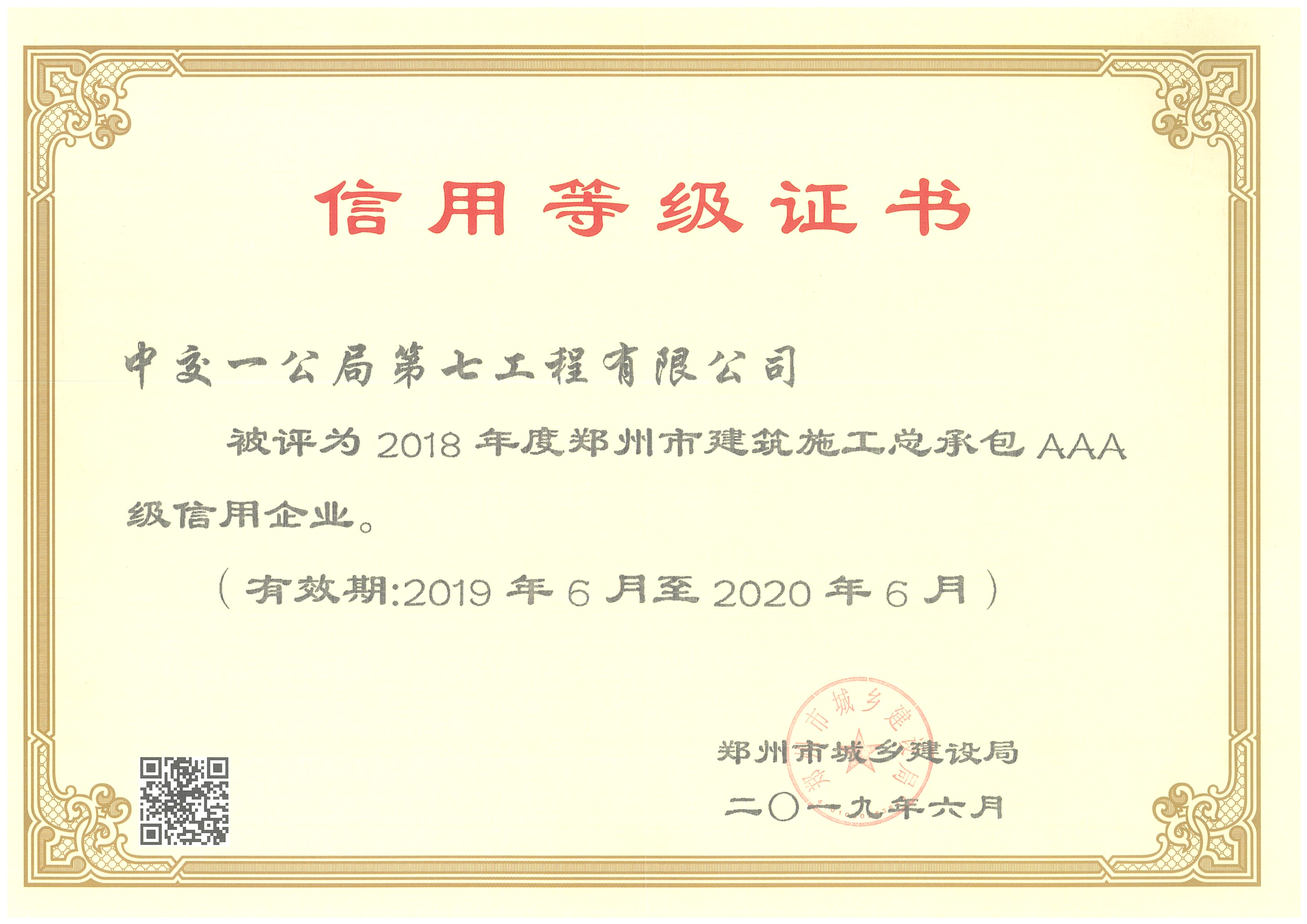 公司荣获2018年郑州市建筑企业信用评价AAA