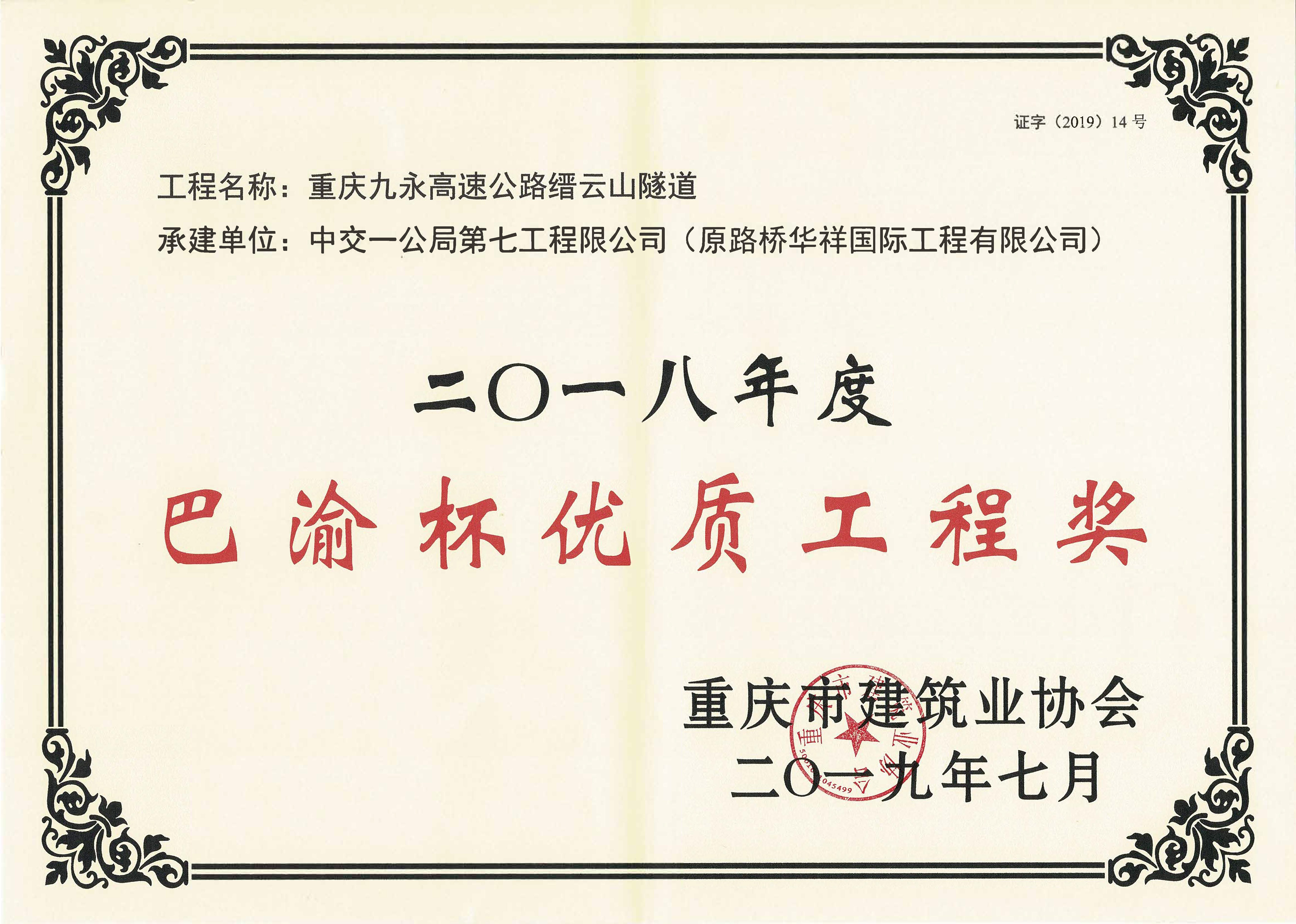 重庆九永高速公路缙云山隧道荣获2018年度巴渝杯优质工程奖