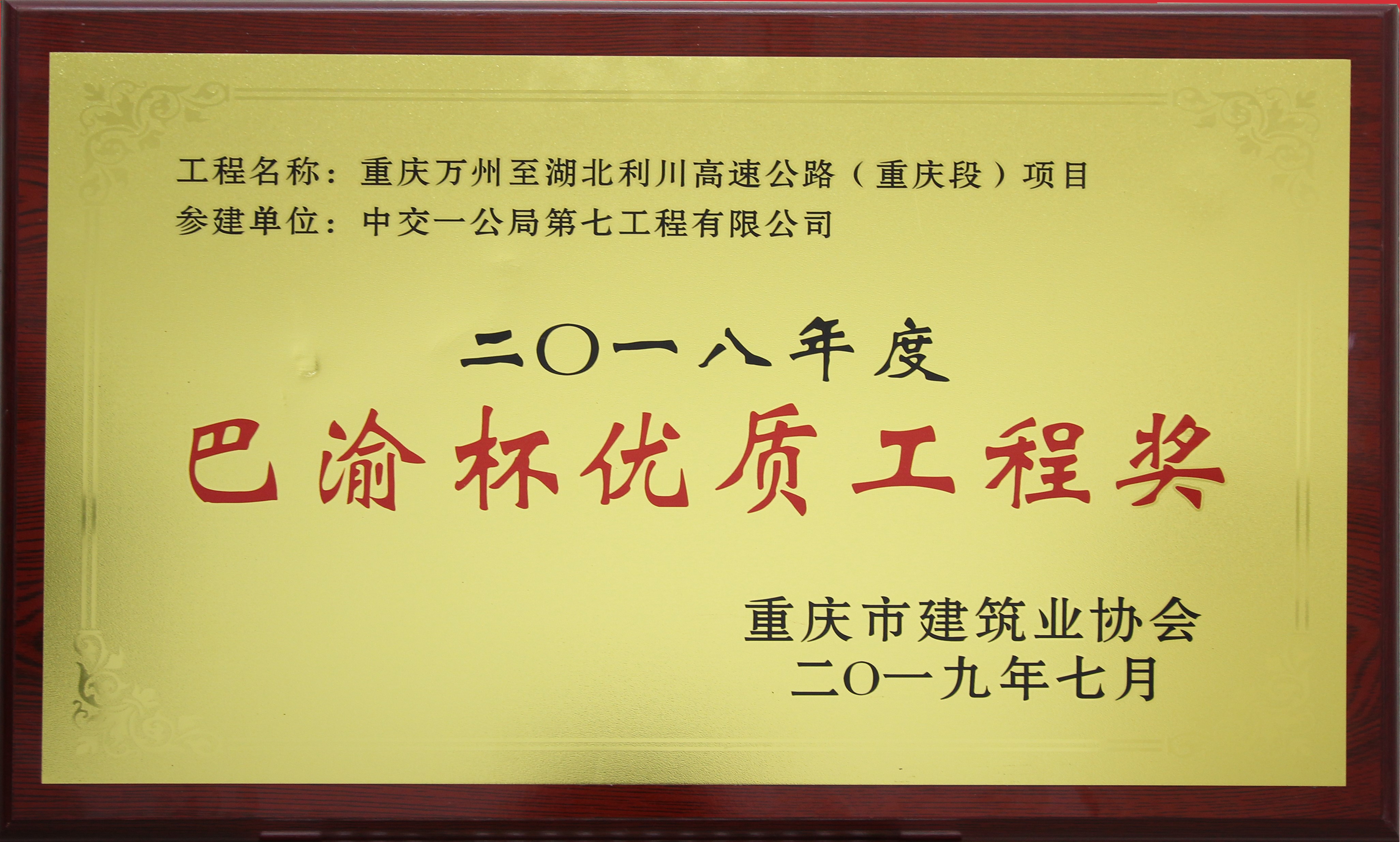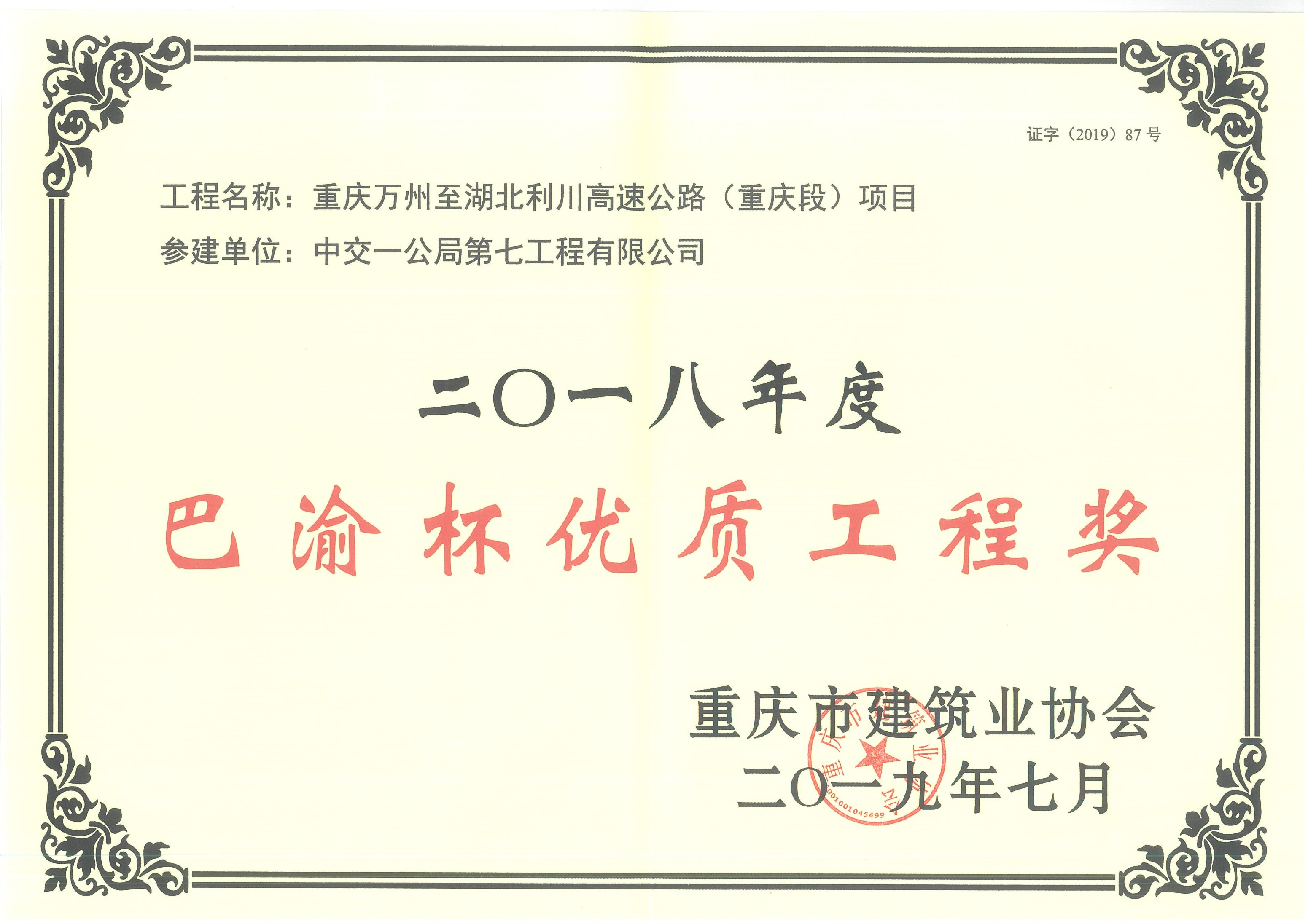 重庆万利至湖北利川高速公路(重庆段)项目荣获2018年度巴渝杯优质工程奖