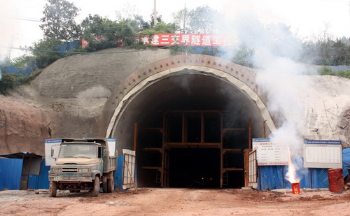 三交界隧道全长532米,位于重庆市合川区古楼镇境内,隧道为双线设计,洞内采用有碴轨道结构,进口为斜切式洞门,出口为明洞门。采用明挖法和暗控法施工,设置复合式衬砌,横穿212国道埋深仅为20米,而且该隧道为低瓦斯隧道,施工难度和安全风险尤为突出。