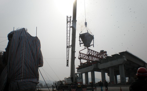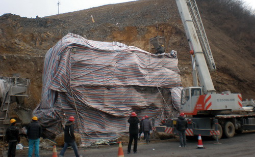 3月12日,路桥华祥国际工程有限公司辽宁省抚通高速公路八标项目二道沟大桥9#敦左幅立柱恢复施工。上午9:40,第一车砼运到施工现场。早已准备就绪的施工人员点燃鞭炮,庆祝复工。项目经理吴敌赶到施工现场,检查冬季施工保温措施是否完善,并再三嘱咐现场施工管理人员一定要加强立柱砼的保温养生,确保砼强度。