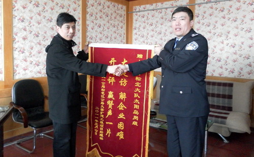 3月14日、16日,中交一公局哈尔滨松花江公路大桥项目经理部办公室主任杜建辉代表项目部分别向哈尔滨市公安局松北区交通大队一中队、顾乡交通大队一中队送去了“大走访,解企业困难;开门评,赢赞声一片”、“心系北跃,坚强后盾;保障畅通,为民服务”的锦旗和感谢信,以表达项目部对交警们的感激之情。
