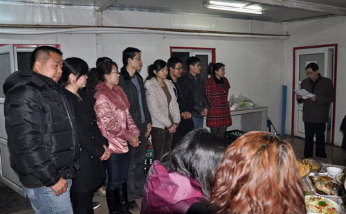 昨晚婚庆宴席一开始,由陈书记代表项目宣读新婚贺词,项目经理祝清峰代表项目传达项目对他(她)们祝福,并对六对新人分别发放礼包一份,情侣手表一件,极度的鼓舞了项目职工的工作热情,让我们再次感受到项目的温暖和领导的关怀。(邢朝峰)