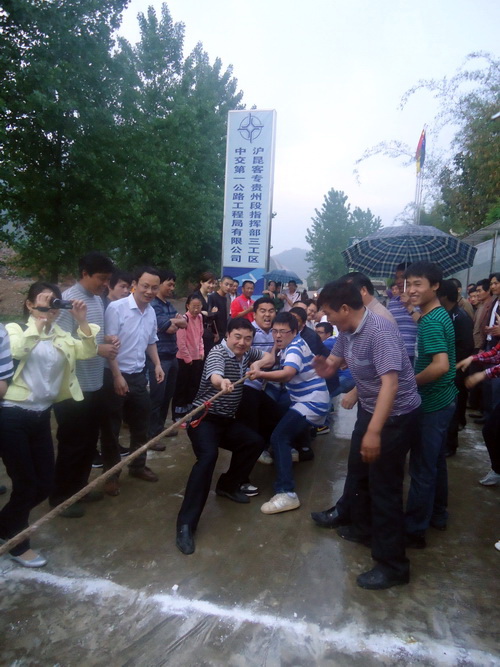 为度过一个欢乐详和、轻松愉快的五一劳动节,也为增强项目全体职员的凝聚力,加强项目与架子队之间的沟通互信,三工区特意将拔河比赛安排在上午单独举行。听:锣鼓喧天、鞭炮齐鸣;看:红旗招展、人山人海。项目经理部领导亲自上阵与架子队进行拔河比赛,各架子队也都派出最强阵容,参赛的8支队伍经过三轮较量之后,项目部代表队力压群雄,以无可非议的全胜战绩勇夺头筹。接下来的活动更是五彩缤纷,热闹非凡,桌球、套圈、乒乓球、羽毛球、飞镖、呼啦圈,所有人员沉浸在无限的喜悦之中。晚上,字项目部又准备了侗族特色的长桌宴,就餐后职工们一同观看了项目部精心准备的“庆五一·迎五四”传唱红歌晚会。