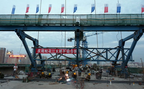 哈尔滨松花江大桥主桥16号墩边跨的顺利合龙,标志着哈尔滨松花江大桥建设取得了阶段性的重大成果,为7月20日全桥合龙,8月20日通车打下了坚实的基础。(常魁星 吉恒敏)