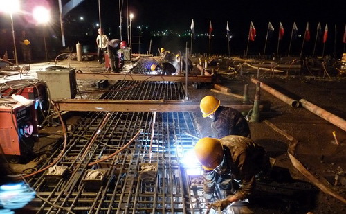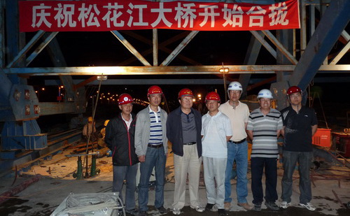 6月26日晚23:23分,中交一公局哈尔滨松花江大桥项目工地彩旗飘扬,礼花绽放,鞭炮声声响彻云霄,挂蓝中央悬挂着:“庆祝松花江大桥开始合拢”的大幅标语,10台电焊机对10根劲性骨架同时进行焊接,宣布哈尔滨松花江公路大桥主桥首段箱梁16号墩边跨现浇箱梁开始合龙。6月27日凌晨2:30分,8束钢绞线张拉完毕,开始浇筑合龙段混凝土,经过两个半小时的紧张有序的浇筑,5:00分,哈尔并松花江大桥首段现浇箱梁浇筑完成。各方参建人员欢欣鼓舞。
