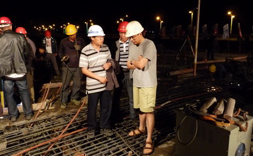 为了顺利完成首段现浇箱梁合龙,项目部做了充分的准备。合龙前,项目部对相关人员进行了技术交底,对合龙施工人员进行了明确的安排,对合龙设备做了详细的检查。哈尔滨市松北区副区长贾锡君深夜莅临现场,检查了合龙的准备工作。大桥合龙时使用了10台电焊机对10根劲性骨架同时进行焊接,焊接完后,采用8台千斤顶对8束钢绞线同时进行张拉,确保在最短时间内浇注混凝土成功。项目经理高俊宏、常务副经理王福来、总工贺友平以及业主、监理等各方领导参加了合龙施工。