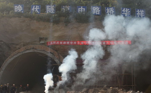 鞭炮齐鸣庆祝晚伏隧道左幅贯通