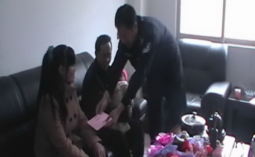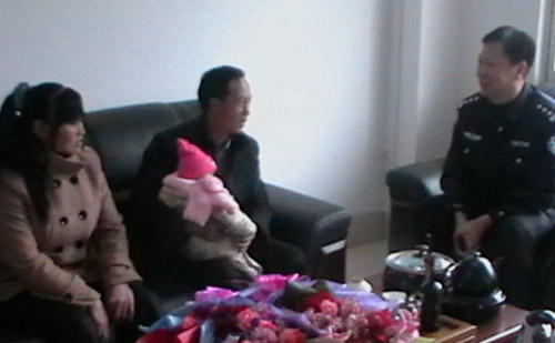 德保县公安局局长黄毅军(右一)亲切慰问陈中华夫妇