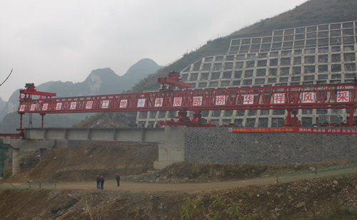 多力1号大桥左半幅桥长687米,右半幅长647米,桥梁上部构造主要采用40米预应力T梁,桥梁下部构造采用双柱墩和实体墩配桩基础,桥台采用重力式U型桥台配扩大基础,多力1号大桥有后张法预应力T型梁198片,预应力T型梁预制采用C50混凝土;T型梁长40米,高2.5米,底部宽度0.6米,桁车道板宽度2.15米。T梁架设采用河南长城起重设备有限公司的JQJ160-40A3型 160吨架桥机进行架设。架梁工作的安排采用边预制边架设的施工方案,为全线桥面铺装争取时间,选择先架右半幅后架左半幅的施工步骤,做到先架先通。