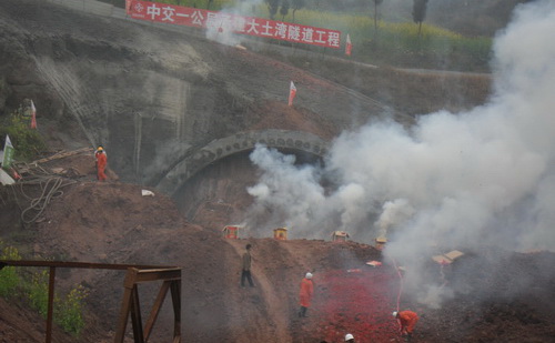 3月15日11:00,随着烟花炮竹声,华祥公司兰渝铁路项目唯一一条自营施工的隧道----大土湾隧道正式进洞施工。