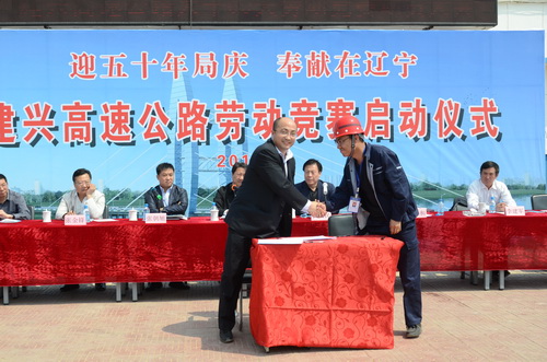 2013年5月6日,建兴高速公路四个项目联合开展的 “迎五十年局庆,奉献在辽宁” 劳动竞赛启动仪式在建兴高速公路第三标段举行。中交一公局党委书记何国民及相关领导参加,何书记在仪式上作了重要讲话,对建兴高速过去一年工作中所取得的成绩表示认可,并对各标段提出了阶段性的目标要求,中交一公局建兴公司总经理乔永和宣读了各标段劳动竞赛具体内容与任务,明确了组织机构、实施方案、考核办法与奖惩措施,随后四个标段项目经理与中交一公局建兴公司签订了责任书,宣读了各标段的挑战书和应战书。并举行了“创建党员先锋岗”、“工人先锋号”和“青年突击队”的授旗仪式。