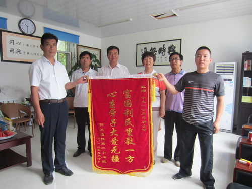 7月27日,辽宁省建昌县药王庙镇八一小学给公司建兴高速公路二标项目部送来了锦旗感谢项目对师生的爱心支持。八一小学校长及校务主任满怀感激地送上了“富国利民重教一方,心系学子大爱无疆”的锦旗,校长感激的说:“感谢你们对我们师生的爱心支持,给我们送来了春天般的温暖。”