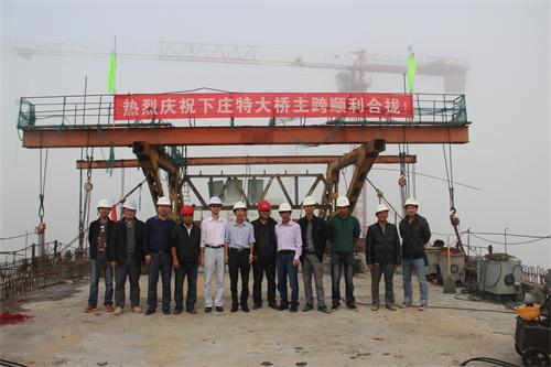 2013年10月9日凌晨,下庄特大桥连续梁施工现场灯火通明,一片繁忙,随着礼炮划破夜空,中跨合龙正式开始。经过全体施工人员5个小时的奋战,于凌晨5点顺利合龙。早八时,局指挥部常务副指挥长王文德、监理项目部中方副总监岳建安、项目部领导班子到现场祝贺。王指挥长发表简短发言,项目经理石军雁代表项目部给予连续梁施工架子队人名币贰万元奖励,并要求项目全体人员以此为契机,鼓足干劲,不遗余力加大施工全工程管理力度,为二次架梁通道顺利贯通再立新功。