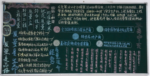 自中交刘起涛董事长提出打造“五商中交”,实现中交升级发展以来,全公司上下迅速展开学习,并向相关领域延伸。板报上虽短短的五组词语,浓缩了该分部全体职工对“中交梦”的向往和努力方向。2014年是该项目所属公司的“经营质量提升年”,在落实公司提升年任务的基础上,项目领导要求人人参与经营,人人懂经营,在打造经理活动分析会平台上增强大家的经营理念和成本意识,提高经营质量。与此同时,该项目就劳动竞赛过程中的“四好一和谐”作出了详细的解释,并还围绕“质量是品格,质量是生命”的质量理念对本项目质量及各分部分项工程施工合格率分别进行了严格要求。