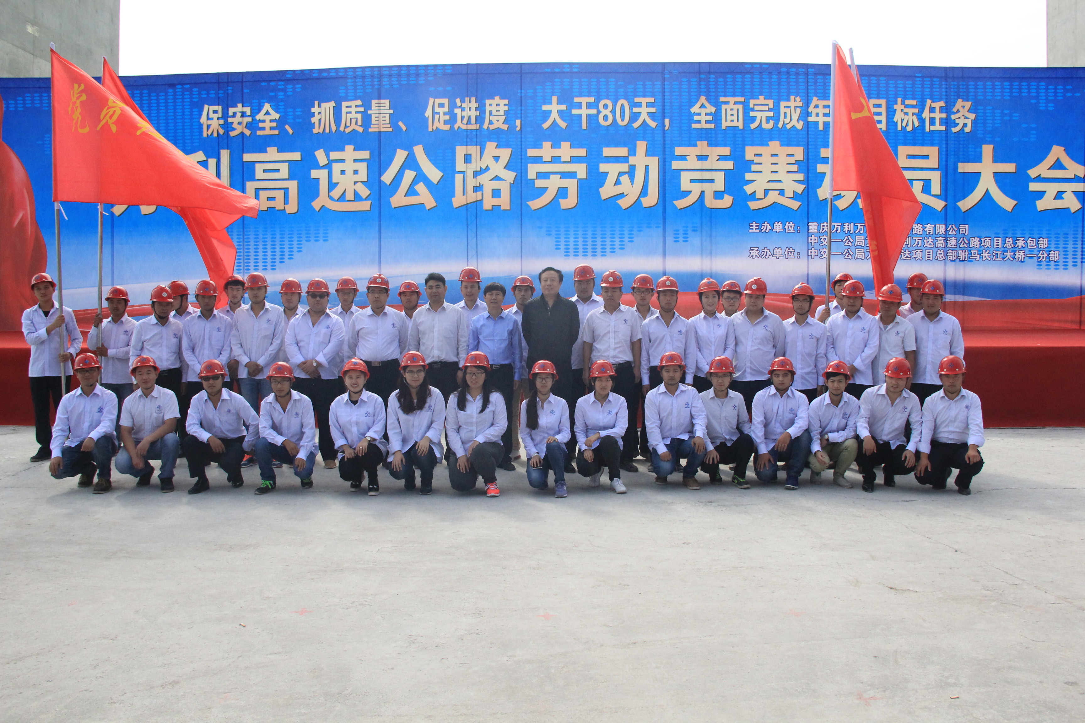 本次劳动竞赛启动仪式,由一公局重庆万利万达高速公路项目部总承包部主办,一公局万利万达项目总部驸马长江大桥一分部承办,重庆市总工会、万州区总工会领导、一公局工会主席庞维新、华祥公司工会主席纪委书记许星火等领导及各方代表共计400余人次参加启动仪式。劳动竞赛的开展,旨在最大限度的调动和发挥广大参建员工的积极性,树立敢打胜仗和硬仗的顽强拼搏精神,各参建单位众志成城、齐心协力,掀起大干高潮,确保完成年度目标。万利五分部一线员工更是认真贯彻劳动竞赛精神,强化落实生产任务,为五分部在此次劳动竞赛当中擂好第一鼓。