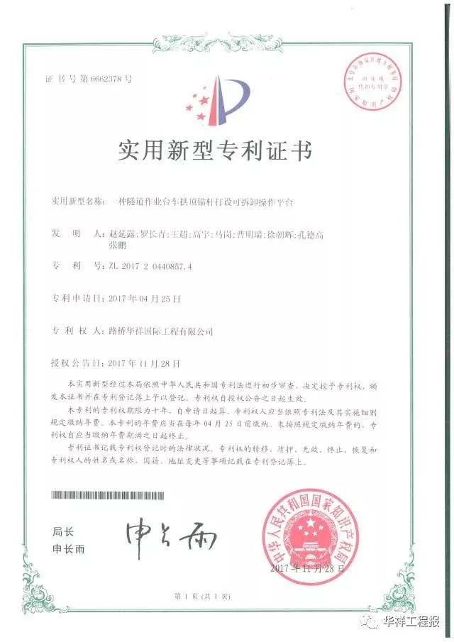 日前,由重庆九永高速二分部罗长青、赵延露、王超、曹明瑞等人完成的“一种隧道作业台车拱顶锚杆打设可拆卸操作平台”获得国家实用新型专利授权。