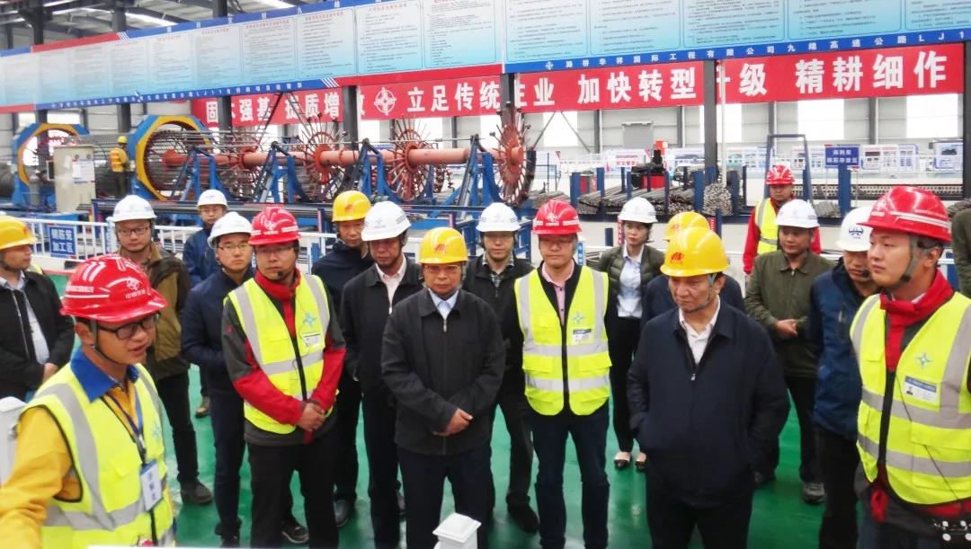 在解说员的带领下,江意华一行人走进项目钢筋加工场,详细了解了场区引进的8台大型数控设备,如全自动数控滚焊机、数控调直切断弯曲一体机、拱架焊接机器人等。重点观摩了项目自主研发的钢筋弯弧机和半自动滚笼机,并表示,设备的研发对于提升工作效率、保证本质安全、提高产品合格率起到了十分重要的作用,项目全体人员要继续发扬大胆探索、积极创新、敢于实践的精神,为打造绿色环保的品质工程添砖加瓦。