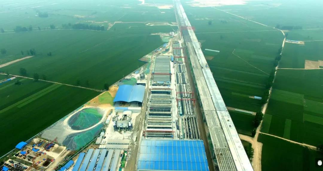 项目承建国道107官渡黄河大桥北引桥装配式T梁段,全长3.81公里,承担着1512片T梁预制安装任务,其中40米梁702片,50米梁810片。整个预制梁场分为钢筋加工区、制梁区、存梁区、提架梁区等四大功能区域,共设置41个预制梁台座、2个存梁区域。从去年3月25日完成首片T梁拉开全线上部结构施工的序幕,中间经历环保停工三个月,截止今日历时450天,圆满完成全部T梁预制任务。