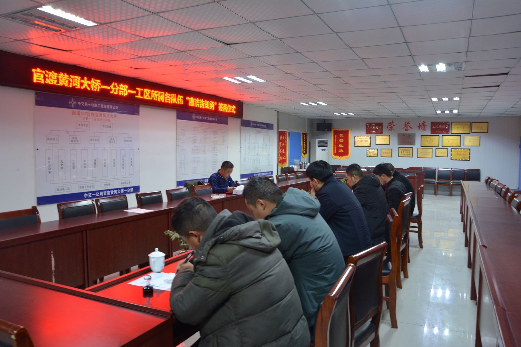 会上,经营部人员将“廉洁告知函”逐一发放给各协作队伍现场负责人,项目书记商胜利告诫各队伍应仔细阅读告知函内容,并签字盖章留存。会后,项目制作了廉洁宣传条幅,在施工现场和协作队伍生活区进行悬挂,营造廉洁文化氛围。 (杜向玉)