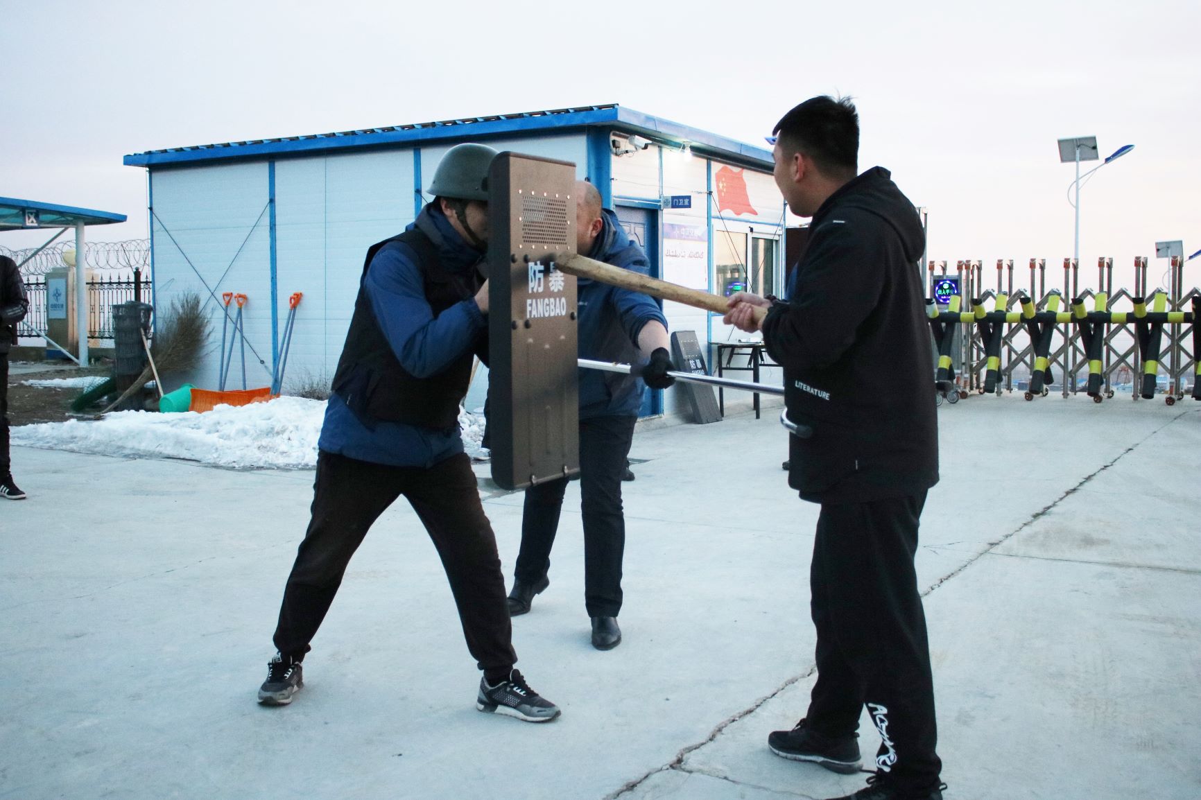 演练开始前,安全部长对防护盾牌、钢叉、长棍等防护性器材的使用方法进行演示。