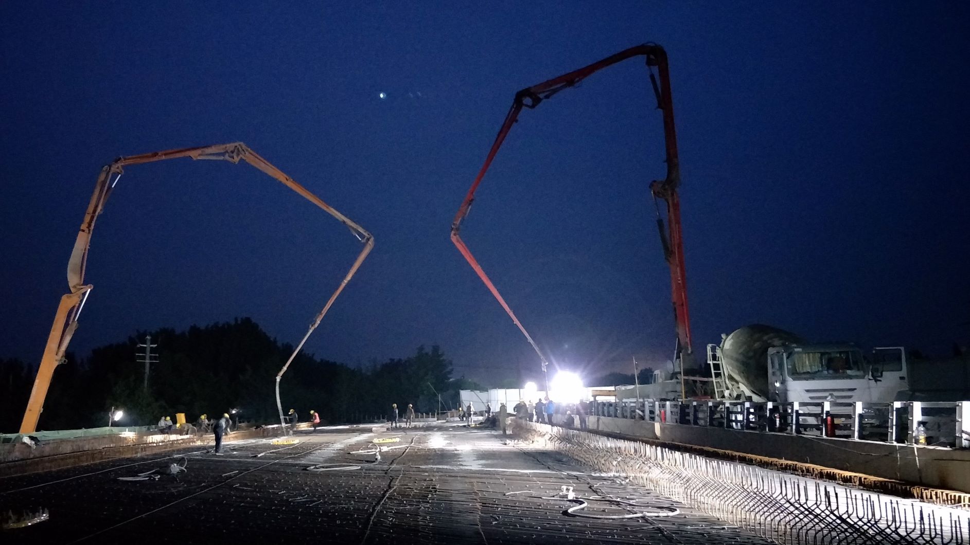 魏河桥右幅01联现浇梁全长90米,拼宽24.5米,梁高1.5米,经过近30个小时的持续奋战,完成所有浇筑工作。截至目前,跨魏河桥仅剩左幅02联现浇梁未浇筑,预计5月底完成,届时跨魏河桥将实现双幅贯通。(单东)