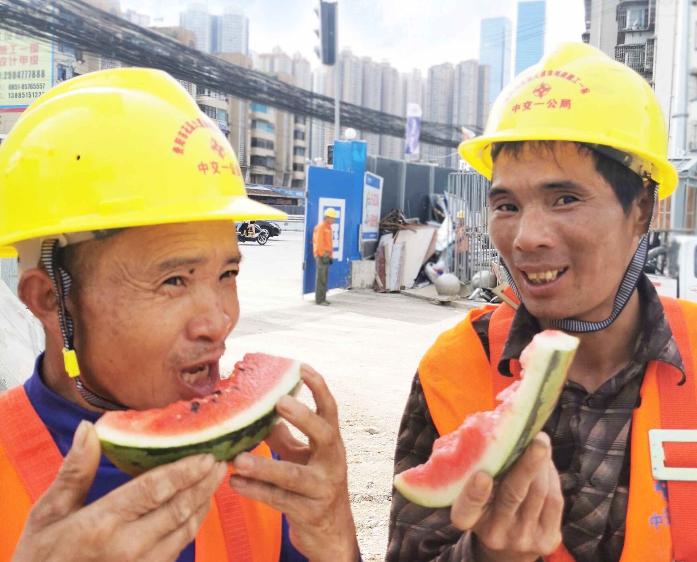 炎炎夏日,火热的太阳炙烤大地,似火的骄阳,逼人的暑气,给我们的工作和生活带来了严酷“烤”验!但在施工一线的员工仍冒着酷暑坚守在工作岗位,为关心关爱高温一线作业职工的身心健康和劳动安全,近日,贵阳花溪大道一标、人民大道六标项目工会开展2019年“夏送清凉”关爱活动,确保广大职工度过一个安全、健康、清凉的夏季。项目党支部书记、工会主席洪顺志和项目副经理臧晓龙带队组成慰问小组,为现场技术员、工地农民工送去了西瓜、冰水、藿香正气水等防暑物品。