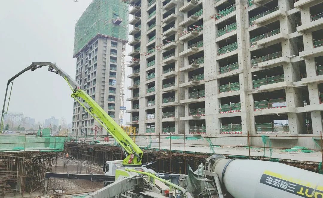 2月24日清晨,中牟安置房建设项目马顶堡社区、桃村李社区第11、14流水施工段筏板基础开始浇筑,标志着项目复工生产正式启动。