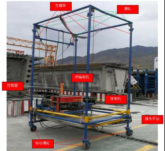 由卷扬机械转动,带动传输皮带夹持衬管进行传输运送,从而保持可进、可退、可连续传送的一种装置,既保证了波纹管穿束施工质量、又起到了提高施工功效,保证操作安全的作用,具有良好的经济效益。