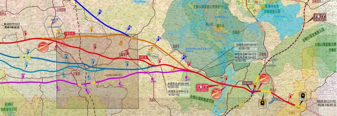 沿大别山高速公路鸡公山至商城(豫皖界)项目起于河南省信阳市罗山县灵山镇西南,接已建成的京港澳高速,路线大致呈东西走向,止于信阳市商城县伏山乡分水岭村、六安市金寨县汤家汇镇夏家中塆村附近,全长约122.79公里,采用双向四车道标准建设,设计时速120公里。