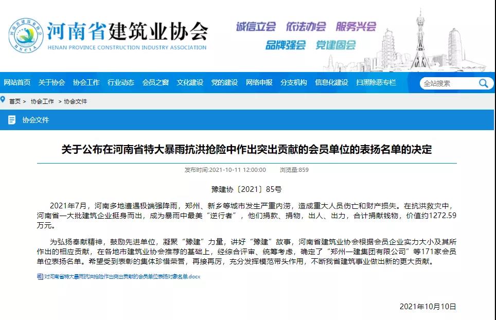 10月11日,河南省建筑业协会发布了在河南省特大暴雨抗洪抢险中作出突出贡献的会员单位表扬名单,公司荣获表彰。