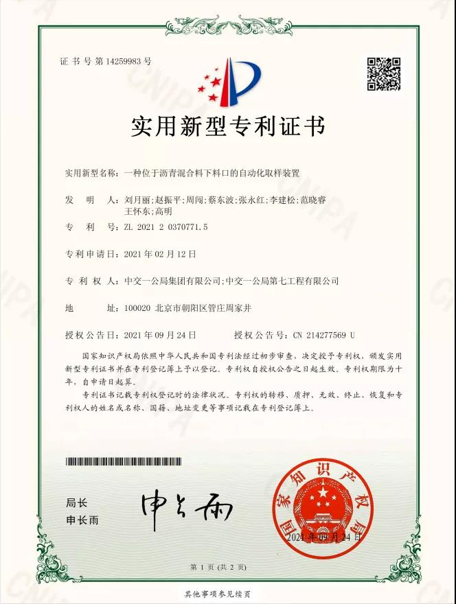 近日,公司申报的《一种位于沥青混合料下料口的自动化取样装置》获国家知识产权局实用新型专利授权。
