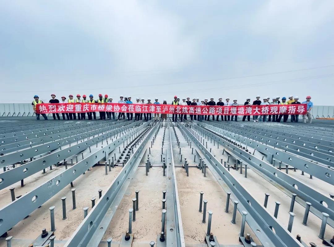 近日,重庆市桥梁协会、中铁长江设计院及业主公司组成“百人观摩团”齐聚重庆江泸北线一分部参观堰塘湾大桥。