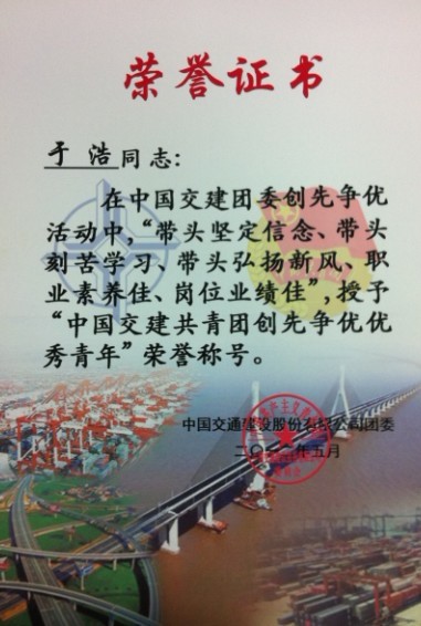 喜讯:于浩同志 授予“中国交建共青团创先争优优秀青年”荣誉称号。