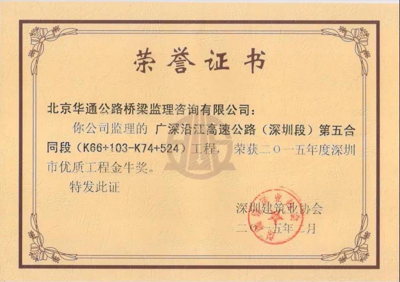 项目建成后获得了业主和当地主管部门的认可,工程获得深圳市建筑业协会颁发的最高奖项——“优质工程金牛奖”。杨茂林获得了业主的嘉奖及公司颁发的“2013 年华通公司突出贡献个人”和“2013 年华通公司文明职工”称号。通过实践积累,他撰写了《60m 整体箱梁架设首件施工的监理控制分析》一文并在专业杂志上发表。与此同时,杨茂林先后考取了试验员、一级建造师、交通监理工程师、建设监理工程师等证书,不断用实践检验真知。