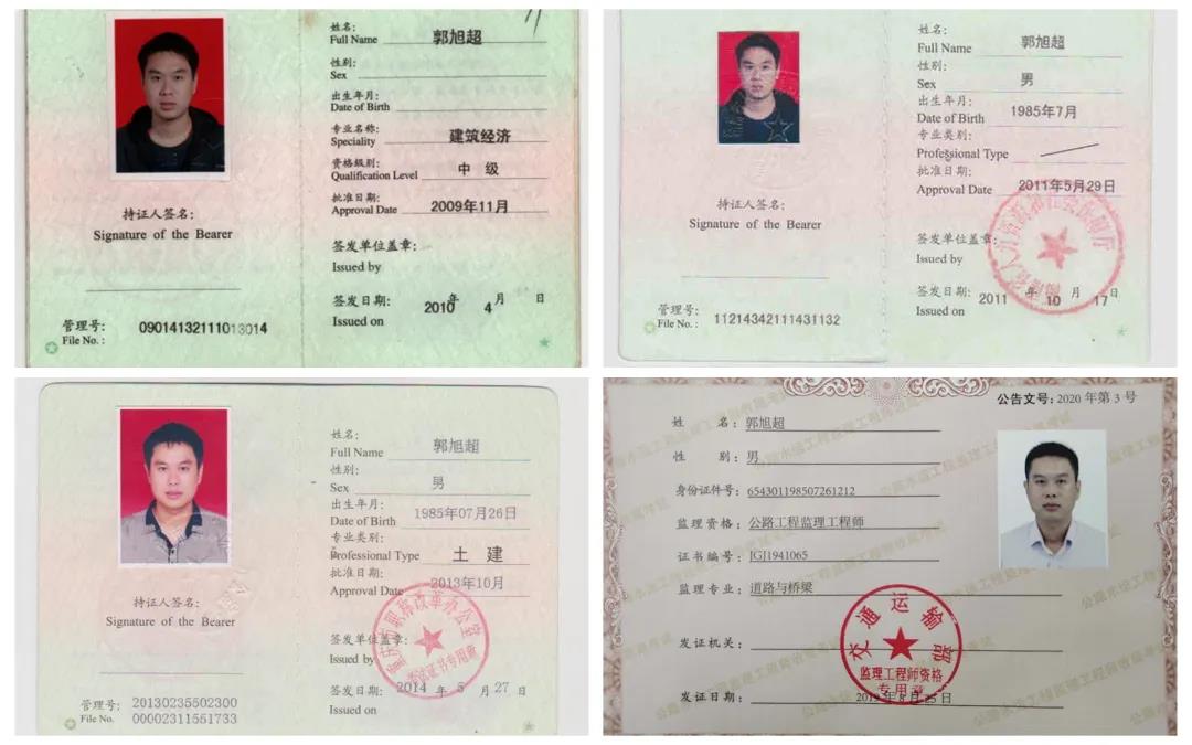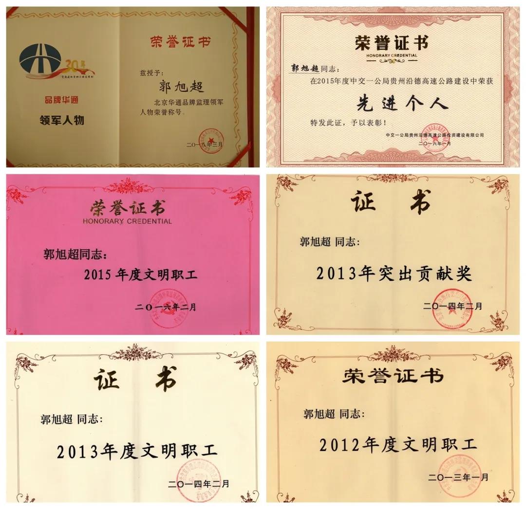 2007年至今,郭旭超多次荣获公司“文明职工”称号。荣获2013年度公司突击贡献奖;2015年中交一公局贵州沿德高速公路先进个人;2015年度一公局优秀青年技术干部;2018年品牌华通监理领军人物;2019年云南大戛项目“优秀高级驻地监理工程师”;他参建的贵州沿德一监理办荣获2015年度中交一公局贵州沿德高速公路“先进集体”;沿德高速公路土建二标被评为2018年度贵州省“黄果树杯”优质工程。他所负责的云南大戛一驻地办荣获2018年度大戛高速公路“先进集体”,2019年度云南省监理企业信用评价获得“AA”级。