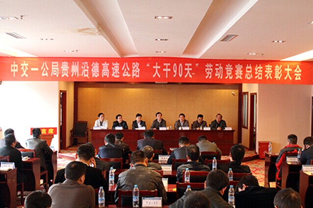 11月6日上午,中交一公局贵州沿德高速公路“大干90天”劳动竞赛总结表彰大会在德江县隆重举行,局工会办公室主任李建军、沿河县高速公路指挥部常务副指挥长李仕学、德江县高速公路指挥部常务副指挥长张羽龙、沿德公司总经理王铁红,副总经理周贵云、李秀明、总工程师吴云等领导出席表彰大会。