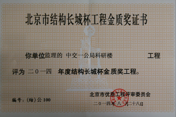 我公司承监的中交一公局科研楼工程被北京市优质工程评审委员会评为2014年度结构长城杯金质奖工程。