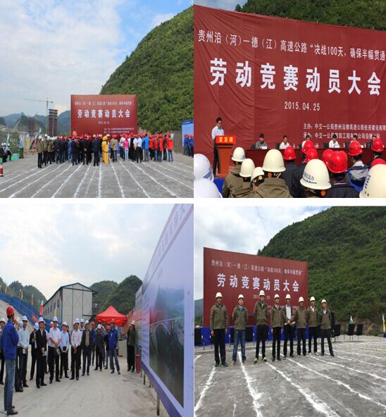 2015年4月25日下午,贵州沿德高速公路“决战100天,确保半幅贯通”劳动竞赛动员大会在沿德土建7标马蹄河特大桥施工现场隆重召开,贵州省交通厅工会主席万鸣,中交一公局党委副书记、纪委书记、工会主席庞维新,铜仁市、沿河县、德江县主要领导及市、县高指,沿德公司总经理、党总支书记王铁红等领导出席了本次大会。各领导分别在大会上对本次动员大会作了重要讲话和部署。2015年是贵州沿德高速实现通车目标的决胜年,为尽快打响攻坚战,激起全体参建员工的潜力,迅速掀起大干快上的施工高潮,形成“奋勇拼搏,永争第一”的良好参赛氛围。