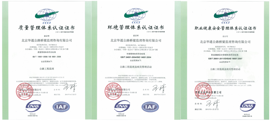 我公司顺利通过ISO 9001:2008质量管理体系;ISO 14001:2004环境管理体系;ISO 18001:2007职业健康安全管理体系认证审核,获得认证证书,此三项认证证书的取得,证明我公司体系运行持续有效,为公司进一步提升管理水平打下了坚实的基础。