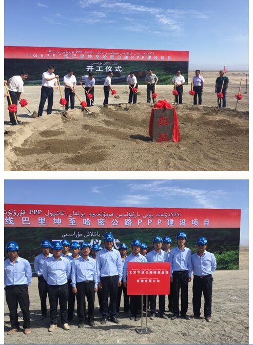 2016年8月26日12时许,新疆公路建设领域首个采用政府与社会资本合作(PPP)模式进行建设的项目——G575线巴里坤至哈密公路建设项目开工仪式在哈密市伊州区主线K76路基段举行,公司总经理雒玉军、总工程师梁志成、副总经理凌悫敏等应邀参加;一公局董事长兼党委书记都业洲、总经理卢静等局领导、哈密市委书记刘剑等自治区领导出席。