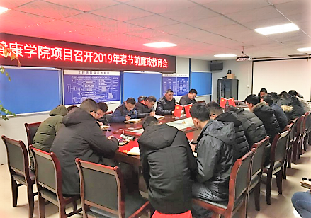 春节将至,为深入贯彻落实作风建设和廉洁自律各项规定,持续深入反对“四风”,坚决杜绝“节日腐败”,确保务实节俭文明廉洁过节,2019年1月19日,建筑公司贵州健康学院项目组织全体员工召开春节前廉政教育会,会议由项目经理王刚主持。