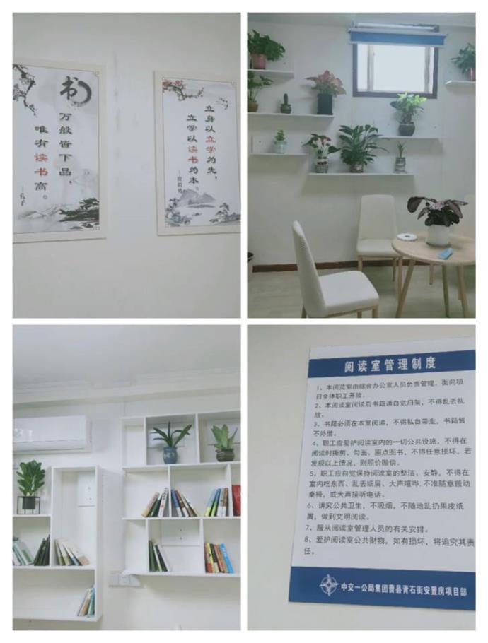 想到读书,大家脑海会浮现,在一个安静的、环境温馨的场所里,一杯茶,点一支熏香,手持一本书,一个舒适的座椅,自己全神贯注的看着书,品味着书中的人生百态,领略书中人物的辛酸苦辣。今天我要描写的是我们曹县项目阅览室也是我心目中温馨的书的小屋。推开门,迎面而来的是一个白色的架子,上面有着各种各样的绿植,绿与白的交织,让浮躁的心骤然平静下来。屋子的左侧是两个劝解语“万般皆下品惟有读书高”,“立身以立学为先,立学以读书为本”,劝解进入书屋的要秉承诚心、认真的态度沉浸到读书的环境中。屋子的右侧浸着书香的各种类型的书依次陈列在书架上,文学名著、习总书记讲话、工程图集等,让人置身在书的海洋。门的旁边是阅览室的制度要求,没有规矩不成方圆,规矩的制定让我的书的小屋熠熠生辉。